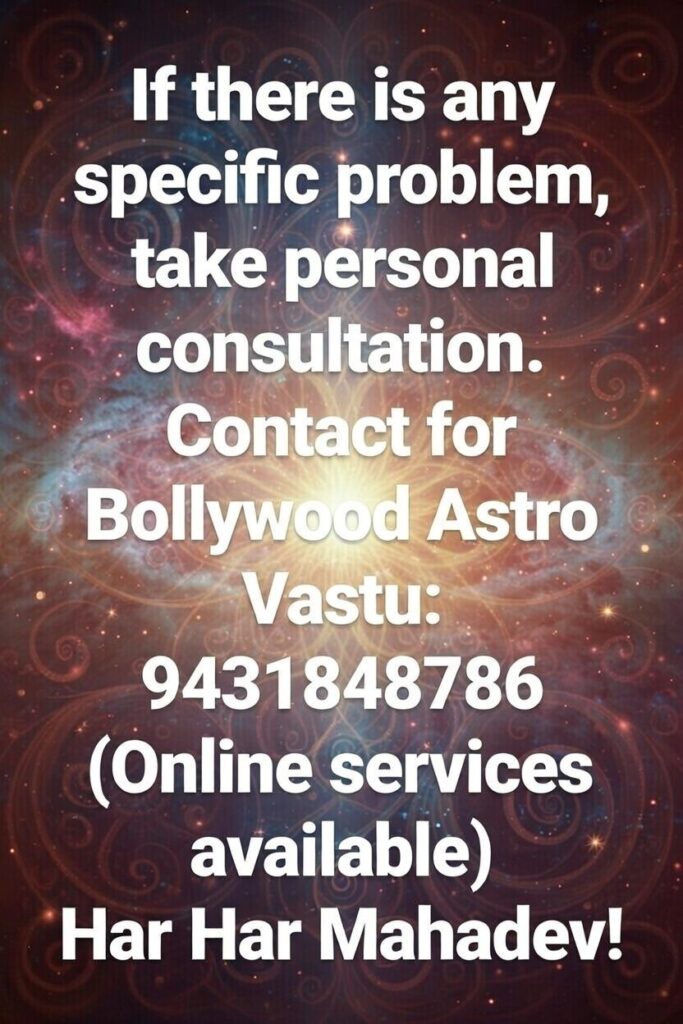 अगर कोई विशिष्ट समस्या है, तो व्यक्तिगत कंसल्टेशन लें। बॉलीवुड एस्ट्रोवास्तु के लिए संपर्क: 9431848786 (ऑनलाइन सेवाएं उपलब्ध)। हर हर महादेव!